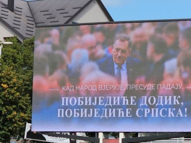 Na bilbordima je ispisano "Kad narod vjeruje, presude padaju. Pobijediće Dodik, pobijediće Srpska!".